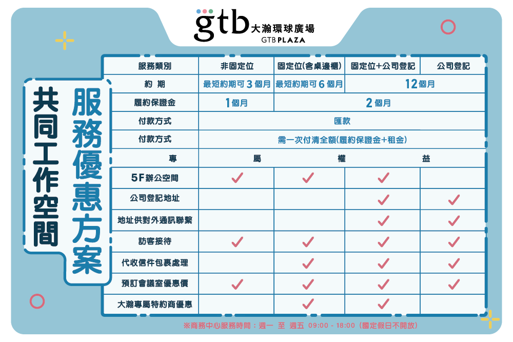 我們的服務、設備齊全,從家具、事務機、全區無線網路、專業雙語祕書到代收發包裹,